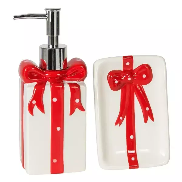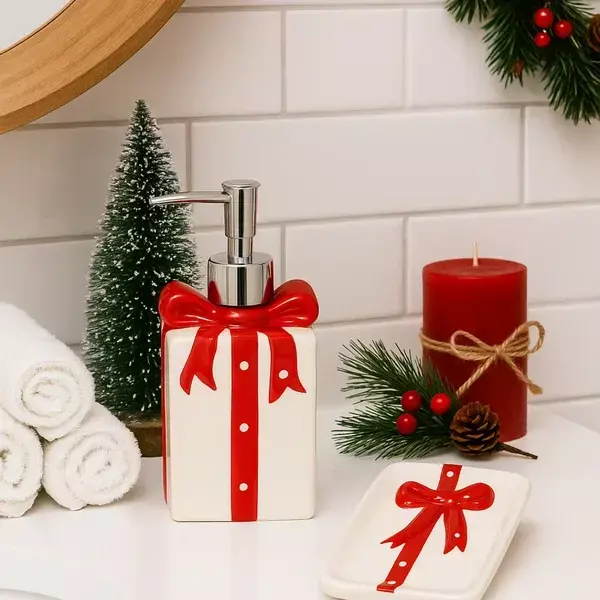 Encante sua decoração com o Conjunto para Banheiro em forma de Presente de Natal da marca Grillo. Composto por 1 saboneteira e 1 porta-sabonete líquido, este kit une funcionalidade e charme festivo. Produzido em cerâmica de alta qualidade, possui acabamento em branco com detalhes de laço vermelho, lembrando um presente natalino. Ideal para deixar seu banheiro mais sofisticado, aconchegante e em sintonia com a magia do Natal, é também uma ótima opção de presente criativo e útil.