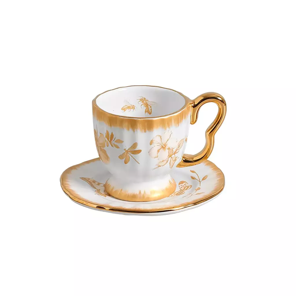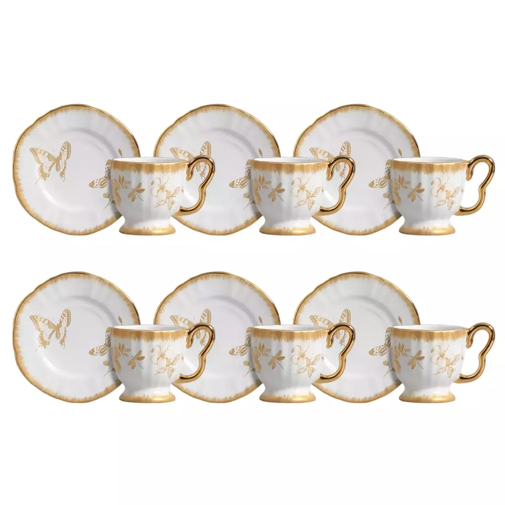 O Conjunto de 06 Xícaras de Café com Pires Demoiselle em Cerâmica é uma verdadeira obra de arte para a sua mesa. Cada xícara e pires é cuidadosamente pintado à mão, apresentando delicadas flores e borboletas em um elegante esquema de cores douradas. A decoração é uma homenagem à elegância e à natureza, com pinceladas suaves e detalhes minuciosos. Imagine desfrutar do seu café favorito nestas xícaras, enquanto a luz do sol dança sobre as asas das borboletas, realçando o brilho dourado das flores.