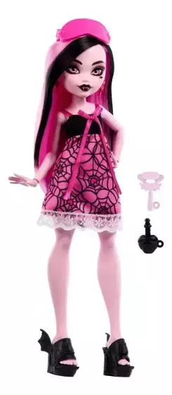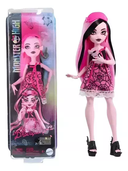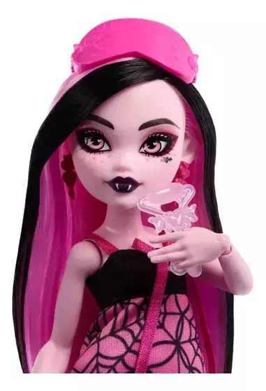 Vestimenta / estilo: Draculaura vem vestida com um pijama estilizado, com rendas, padrões decorativos, detalhes como laços, estampas (alguns anúncios citam estampa de teia de aranha)